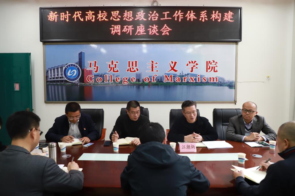 3月17日上午,校党委副书记江潮炳莅临马克思主义学院开展“新时代高校思想政治工作体系构建”专题调研。校党委宣传部长高春晗,学工部(处)副部(处)长郑常鳜,党委组织部组织科涂双斌,宣传部文明建设科陈丹丹,马克思主义学院党政领导、党委组织员、辅导员等参加调研座谈会。