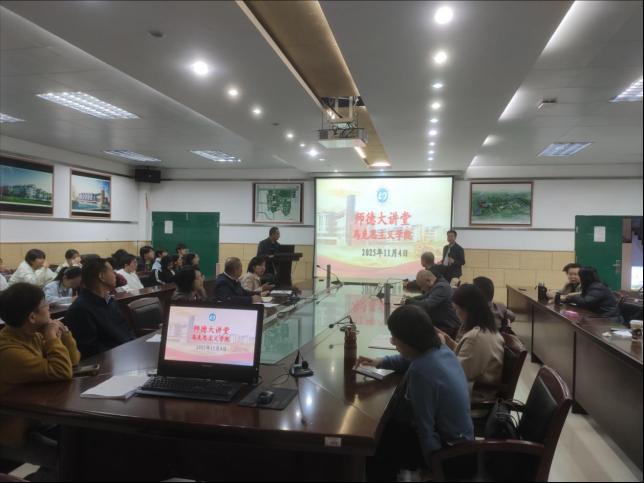 为进一步深入学习贯彻习近平总书记关于教育的重要论述和全国、全省教育大会精神,大力弘扬教育家精神,推进师德师风建设,11月4日下午,马克思主义学院举办“师德大讲堂”,游国斌教授以“立德树人背景下的教师领导力:持续学习与终身成长”为主题展开深度分享。全体教师与2025级思政专业学生参加学习。