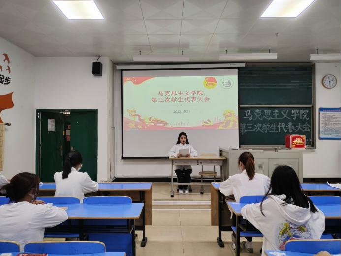 为促进我院广大学生积极参与本院的民主管理,维护学生合法权益,提高学生民主管理和自我管理能力,繁荣校园文化并且选出新一届学生代表,10月21日下午,马克思主义学院第三次学生代表大会在求知楼B区201教室召开,此次会议由马克思主义学院主席团成员兰美霞主持,共50名学生代表出席会议。