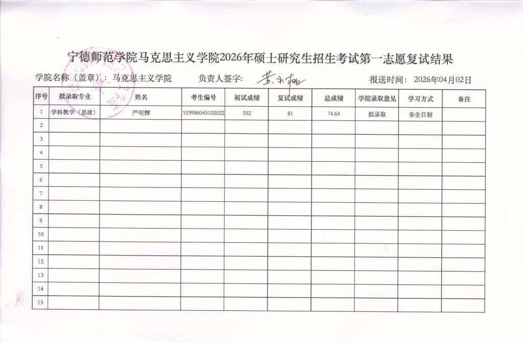 宁德师范学院马克思主义学院2026年硕士研究生招生考试第一志愿复试结果